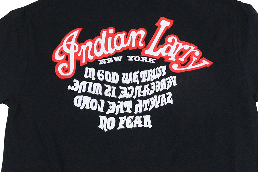 Black cotton t-shirt with an Indian Larry pocket logo with large design on back